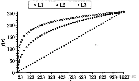 其中L1为传统对数算法,L2曲线为改进后的算法,L3为线性移位算法。可以看出改进后的L2曲线优势是扩 大了中间数值区域的映射范围,提高了该区域的分辨率。