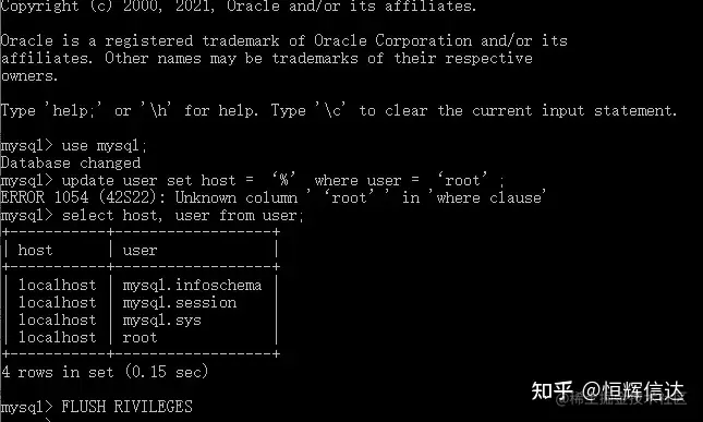 使用管理员模式进入CMD;在登入mysql后,更改 “mysql” 数据库里的 “user” 表里的 “host” 项,从"localhost"改称"%"
