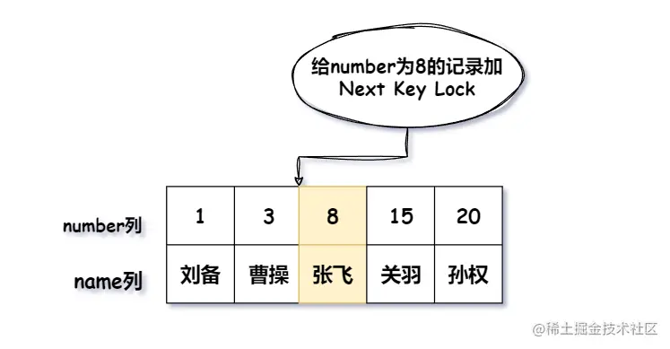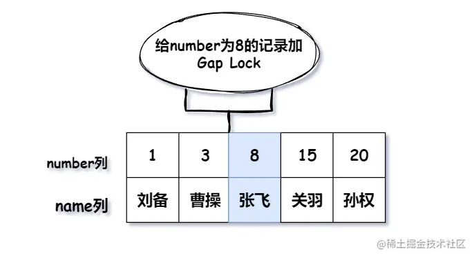 例如给 number = 8 的记录加上Gap Lock,表明(3,8)之间的间隙不能插入新的记录,注意:number 为 8 的记录不会被锁,间隙锁的作用仅仅是锁住前面的间隙而已