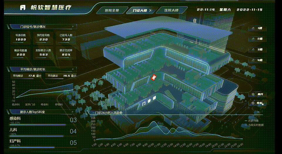 通过简单切换,在FineVis大屏中,用户可以将门诊大楼,分层打开。点击进入具体楼层查看具体楼层状况。可以看到楼层具体的候诊科室以及目前患者挂号就诊情况。
