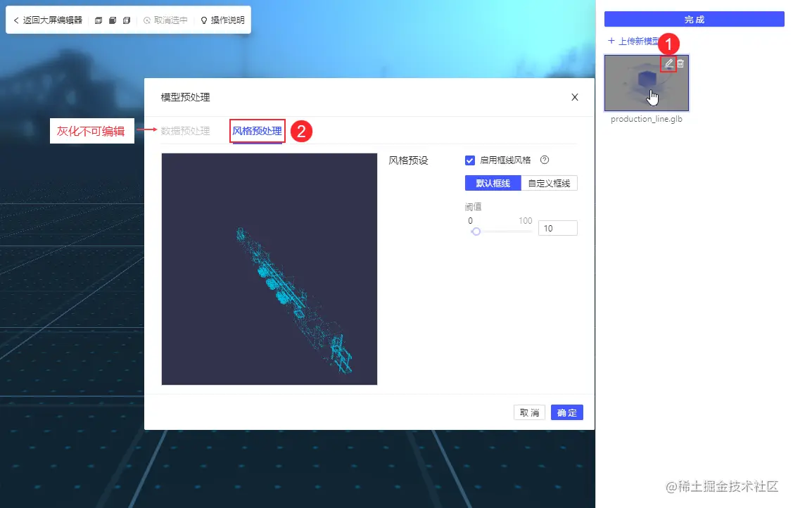 这一效果在实现在FineVis中并不复杂,只需要点选式的配置即可完成原始模型到线框风格的转化。
