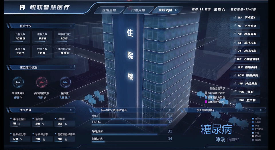 下面是FineVis的可视化智慧医院案例,基于轻量化BIM技术,对医院建筑的整体布局进行3D建模,结合各类2D图表、表格展示的业务指标,能够为医院管理层提供基于地理位置的医疗大数据多分析平台,为医院领导和管理者提供必要可信的辅助决策信息,令医院的资源配置更加合理化,提高医院整体的管理效率。