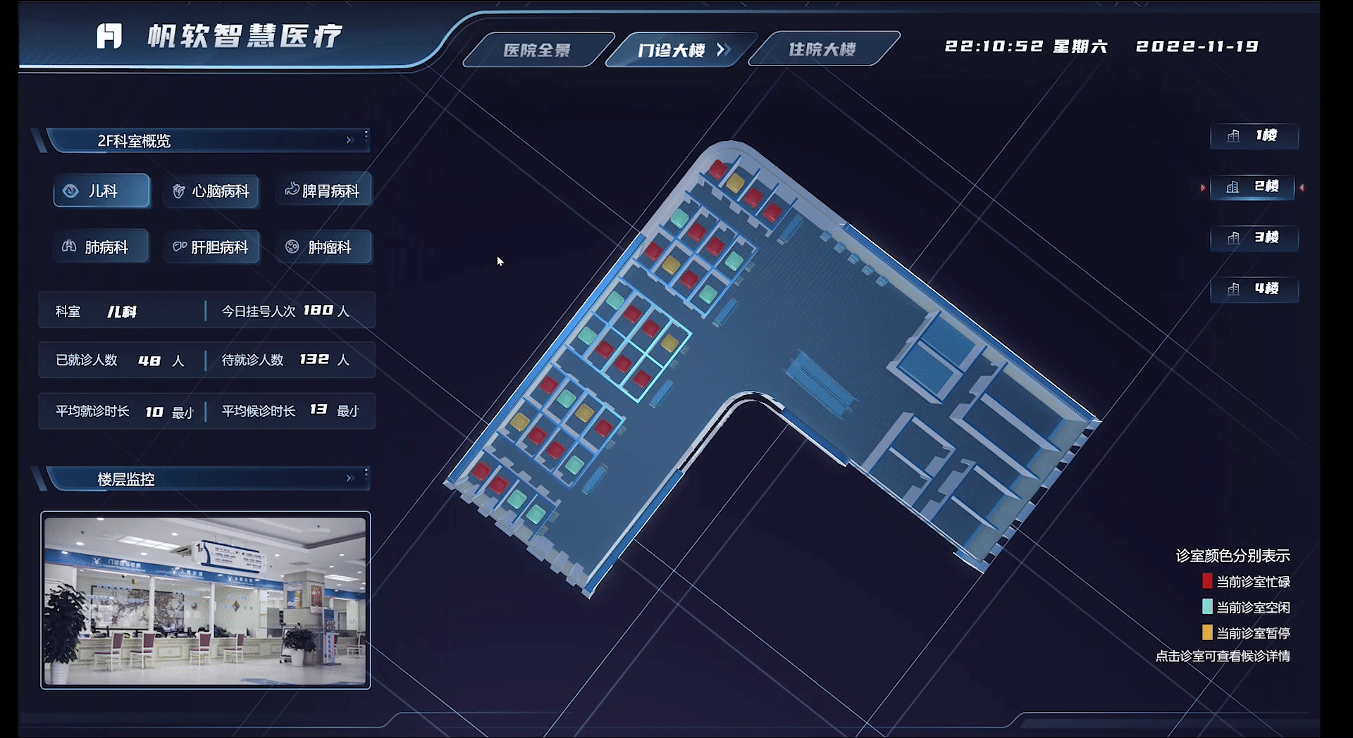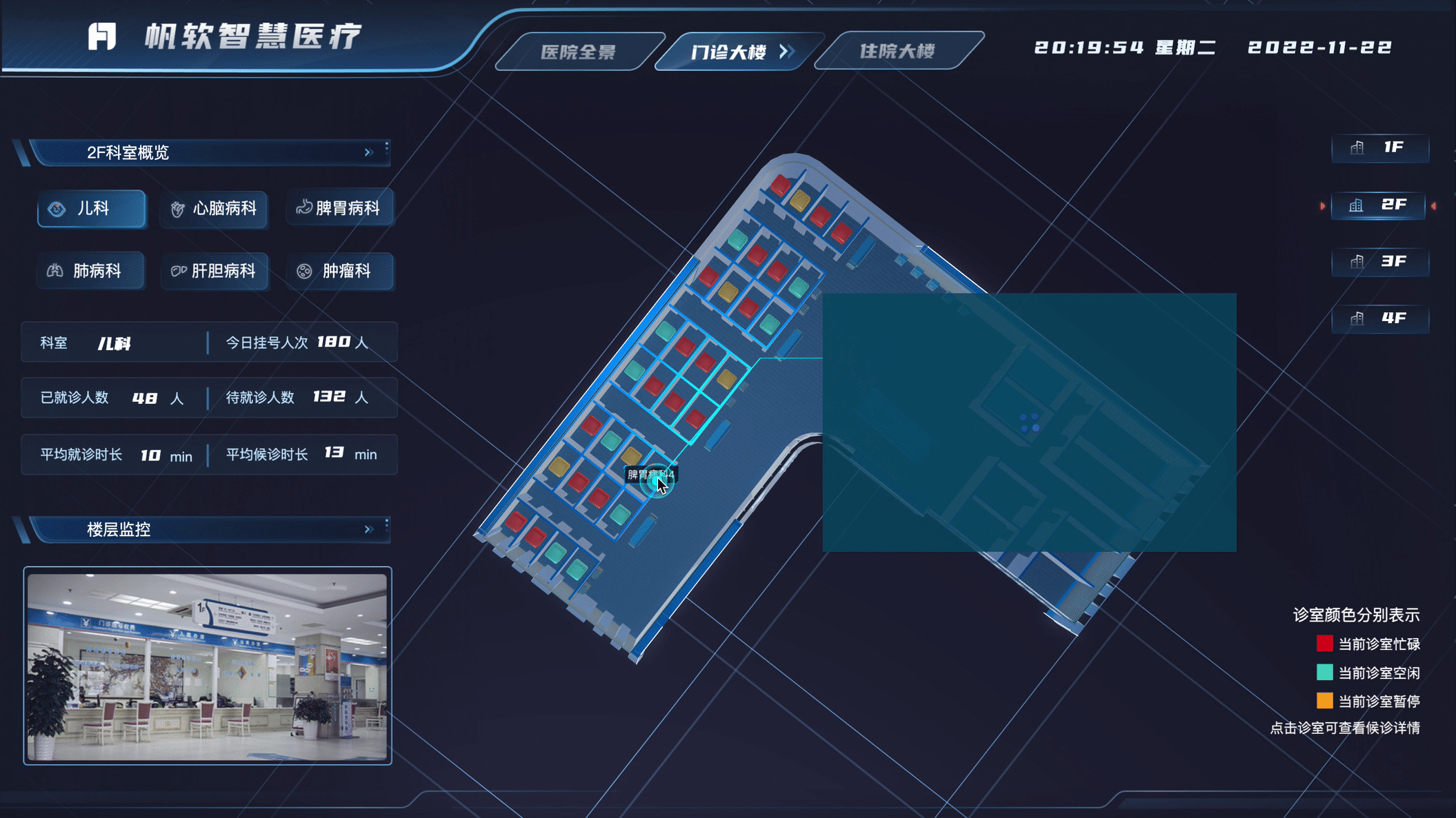 在3D模型方面,将诊室依据平均就诊时长以及候诊人数进行诊室类别划分,当具体诊室平均就诊时长过长以及候诊人数过多时,将其标记为忙碌诊室,同时能够显示其附近的空置诊室,能够帮助医院及时进行合理的诊室资源调度。页面内还可以调用设置在各个点位的监控设备的实时视频流,查看现场实际情况。