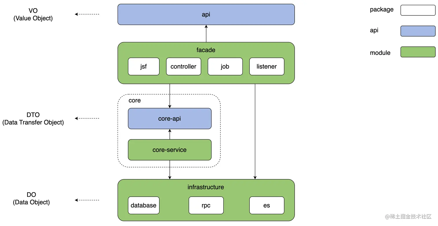 •门面层: 作为程序的入口,通过包隔离来存放JSF服务、Rest服务、定时任务和MQ消费,其中对外提供服务的接口定义存放在单独的api包中。该层的请求定义命名以Request结尾,响应体命名以Response结尾。
