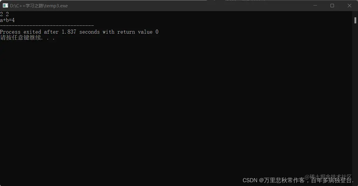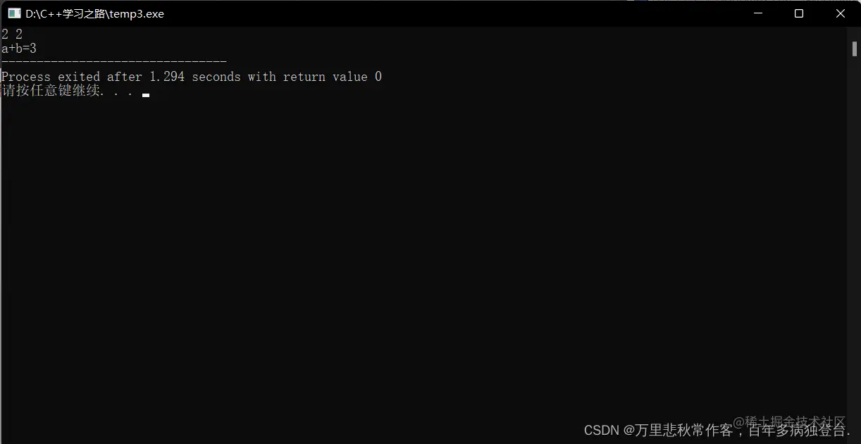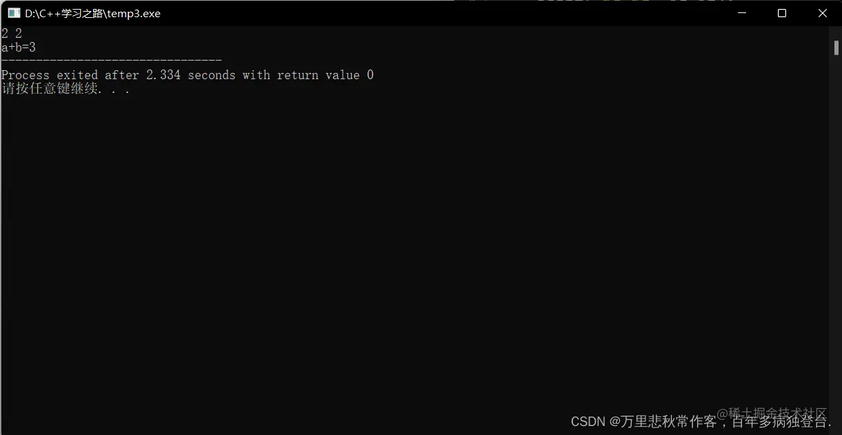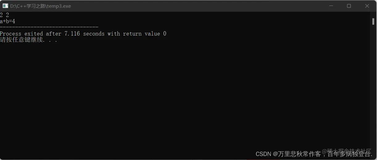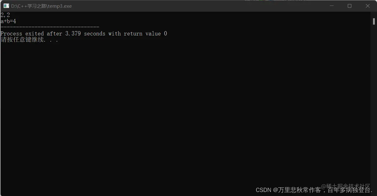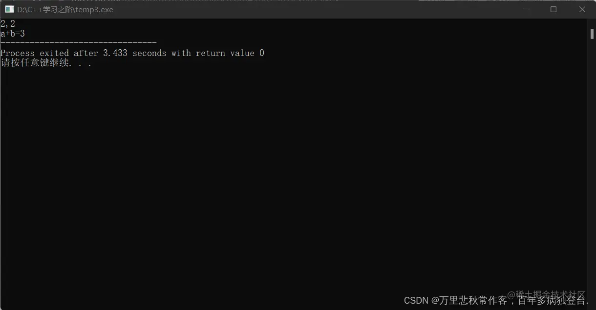 这个程序我们可以看到它运行的结果是错误的!为什么呢,因为我们在scanf中已经指定了输入格式,输入格式是两个数中间用逗号隔开,所以我们输入时也必须在输入的两个数之间加逗号隔开,我们再次输入试一下