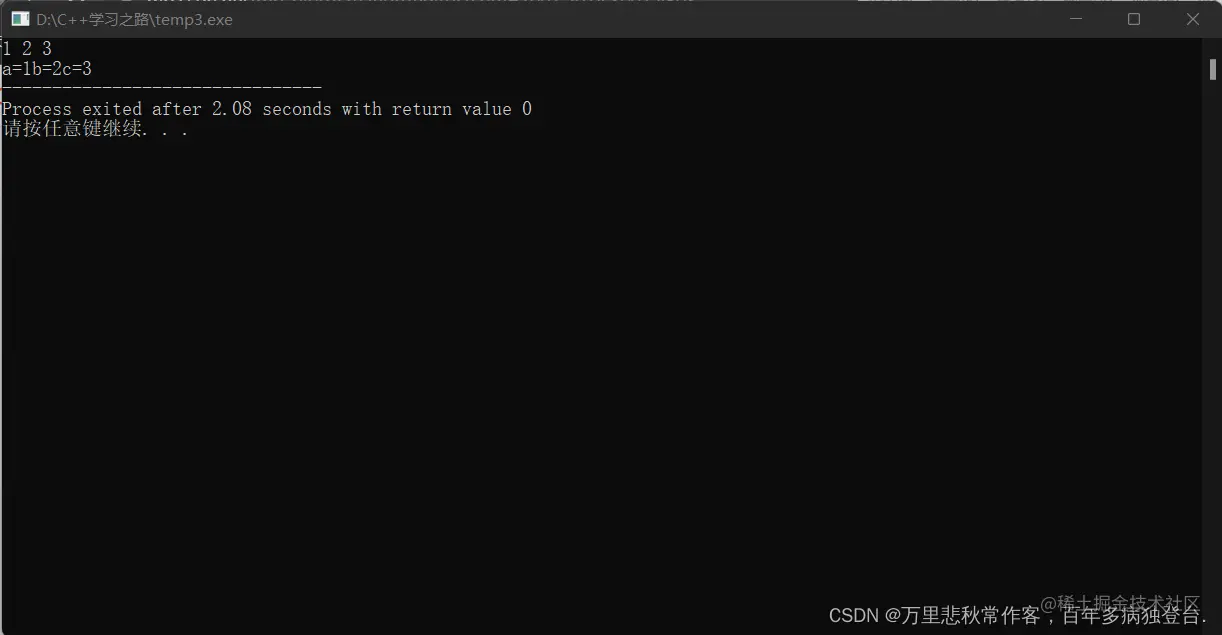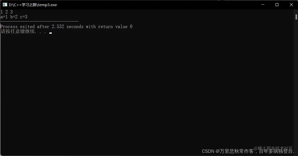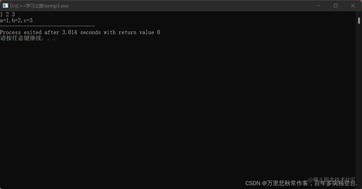 哇哦!答案终于对了!所以我们可以得出一个结论就是scanf中的输入格式是什么样的,我们输入时也就必须和其中格式完全一致,否则就会出现读取错误。