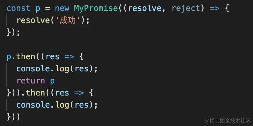 解决方法很简单,只需判断返回值和内部创建的Promise对象是否一样就行了。这里有个问题,我们在new Promise对象的过程中,是拿不到thenPromise这个变量的,所以要把这部分代码变为异步。