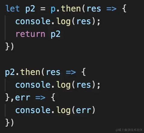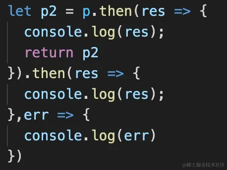 想了一下,应该是因为上面的p2接收的是第二个.then所创建返回的Promise对象,在resolvePromise方法中当然会比对不通过了。想想下面返回结果是什么。