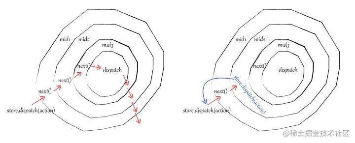 原生的 store.dispatch传入最后一个中间件,返回一个新的 dispatch,再向外传递到前一个中间件,直至返回最终的 dispatch,当覆写后的dispatch 调用时,每个中间件的执行又是从外向内的”洋葱圈“模型。