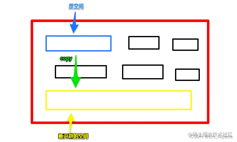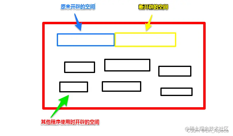 若原空间之后没有足够的空间让新申请的空间使用,则会选择一块新的足够大的空间供程序员使用,同时将原地址释放。