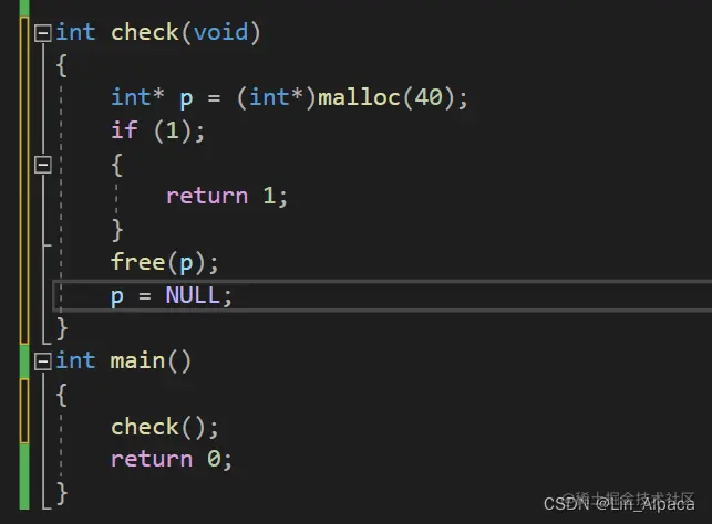如上代码,我们确实做到了一申请一释放,但实际上的结果好像并不如我们所愿。函数进入一个选择语句后就返回了,而p却没有被释放并制空。所以不仅仅是形式上要有一申请一释放而且逻辑上也要做到一申请一释放。
