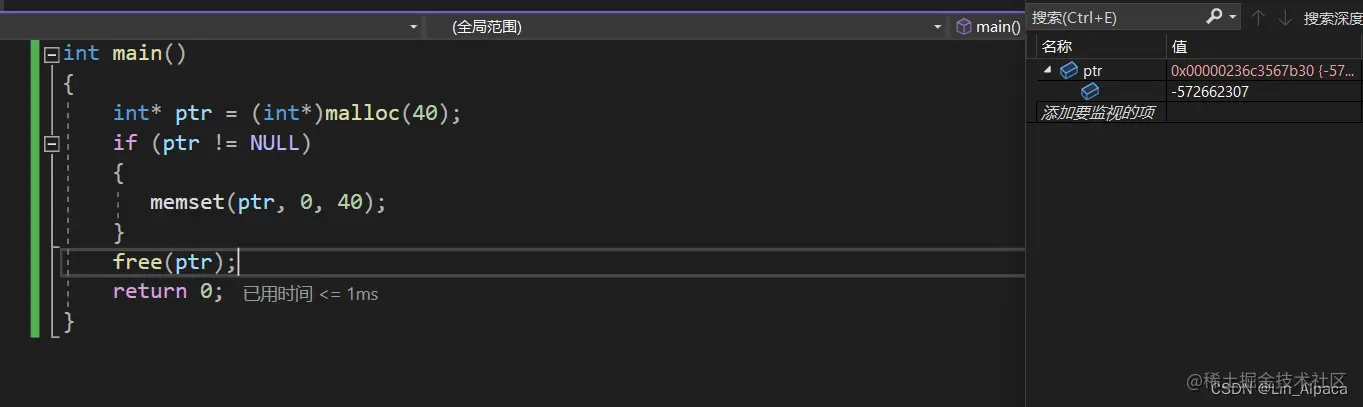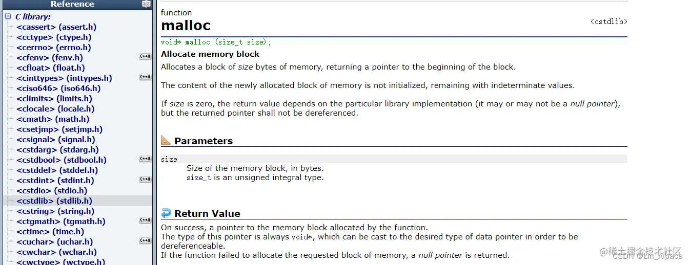 通过查找资料我们得知, malloc 函数需要传参一个单位是字节、数据类型是size_t的数据,即申请一片大小为 size 字节的空间后由于系统并不知道这片空间是用来管理什么数据,所以他返回void* 指针(方便使用者转换)。这是开辟成功的情况,若系统内存不足以开辟如此大的空间,则 malloc 函数便会返回一个空指针,正因如此对于 malloc 的返回值我们必须进行检查,若是对空指针进行解引用操作便会产生错误。同时 malloc 函数的头文件是 <stdlib.h> 所以得先引用其头文件之后才能正常使用这个函数。