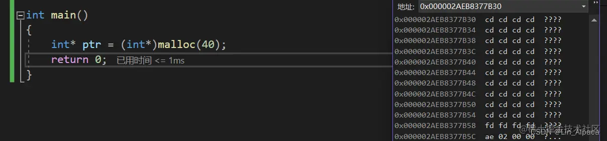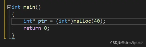 如下所示,我们使用 malloc 申请了 40 个字节的空间并用转换成整型指针进行管理。不禁就想看看这个函数开辟的空间究竟是怎么样的。