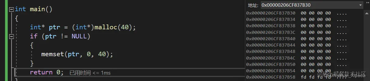 进入调试后,找到 ptr 所指向的空间,我们便可以看到向内存申请的 40 个字节的空间,这时候我们便注意到这些空间里面都存放着 cd 即 malloc 不会对申请的这片空间进行初始化,若要初始化这篇空间,只需要使用memset或是用循环遍历一遍就能完成。