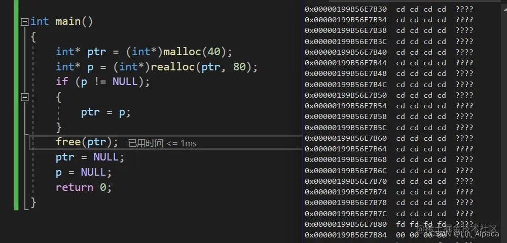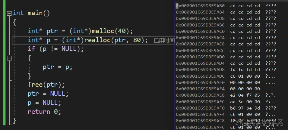 值得一提的是,在 realloc 开辟空间时会出现两种情况,第一种,当原来开辟空间的后面足够我们需要的,便会在原空间之后继续申请空间使用。