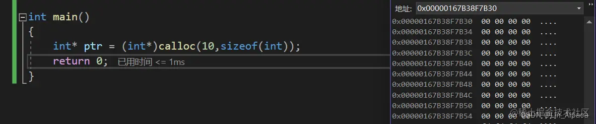 同样,我们用 calloc 开辟十个 int 类型大小的空间(一样是40),并观察整个开辟的空间。我们可以看到,空间内存中都是0,即calloc对所开辟的空间会将其初始化成0,避免发生意外的错误,规避风险。