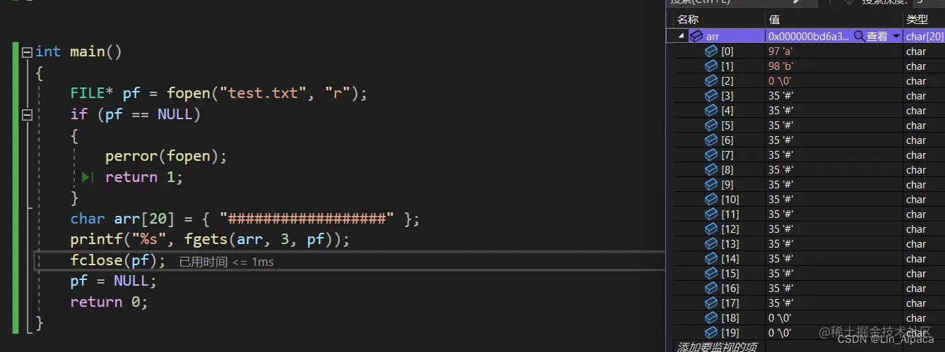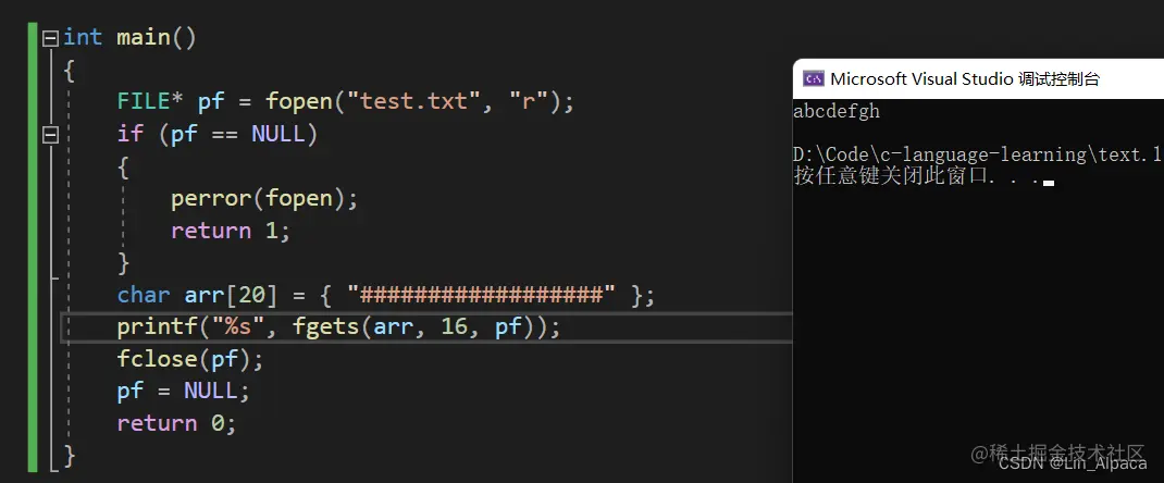 可以看到fgets还会将 \0 一并拷贝到目标数组之中,所以实际上读取到的字符数会比我们传入的那个参数要少 1 。并且读取成功后返回指向目标字符串的指针。