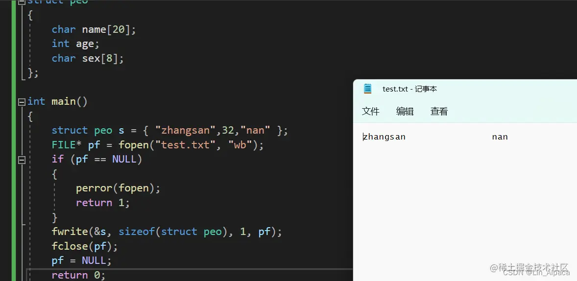 这样子我们便成功将数据以二进制的形式写入文本,但是直接观察文本我们并没有看到有什么太大的变化,但是我们需要知道的是,记事本并不能识别二进制文件,于是他只能反应出他大致能识别出的文件。若我们用二进制的形式再将数据从文件中输入到内存中,我们会发现结果仍然是一样的。
