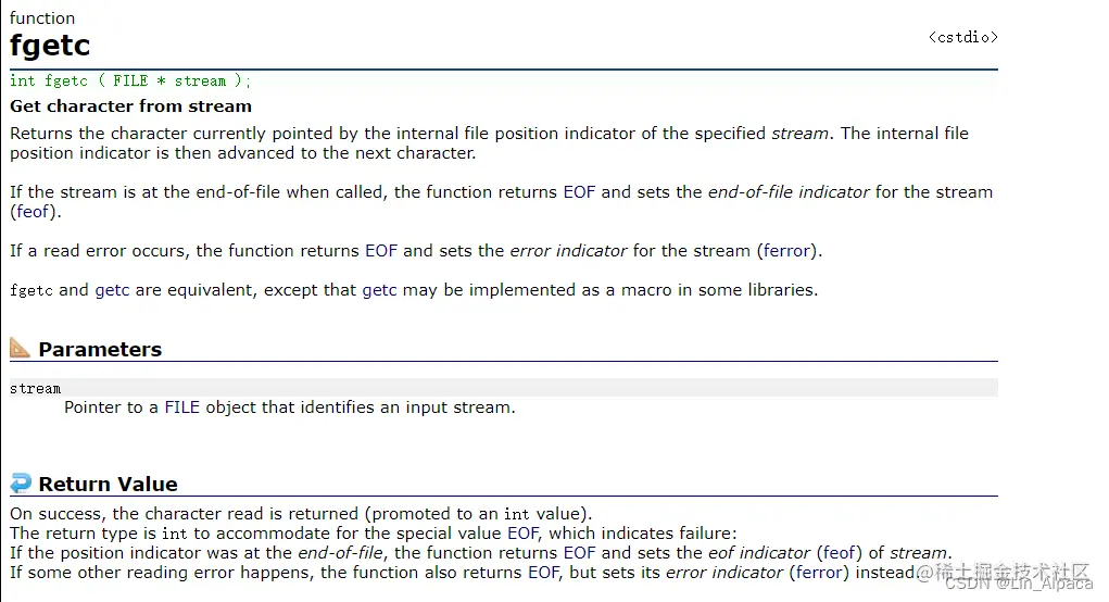 该函数为字符输入函数,需要传入一个 FILE* 的类型的指针之后返回一个整型,该整型为所读字符所代表的 ASCII 码值,若是读取失败则返回 EOF 。