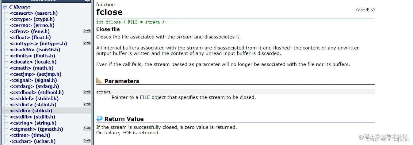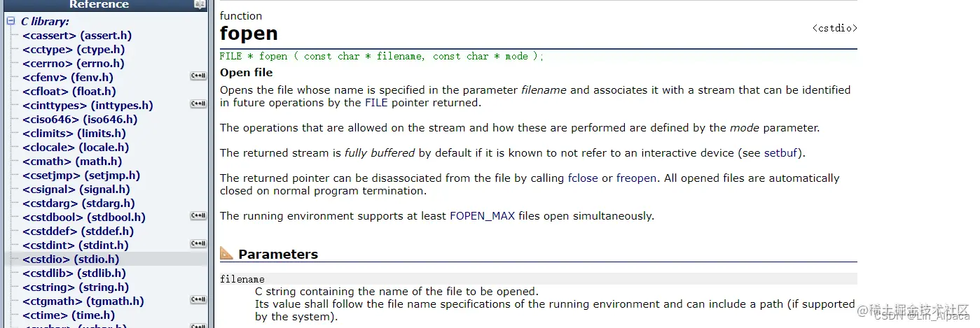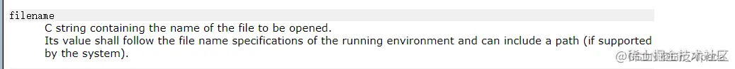 我们知道了其包含在 stdio.h 里面返回一个 FILE* 类型的数据,需要传入的参数有两个,一个是 const char* 类型的文件名,第二个是文件的打开方式。同时两者都代表的是字符串所以在使用的时候一定要注意双引号的使用。