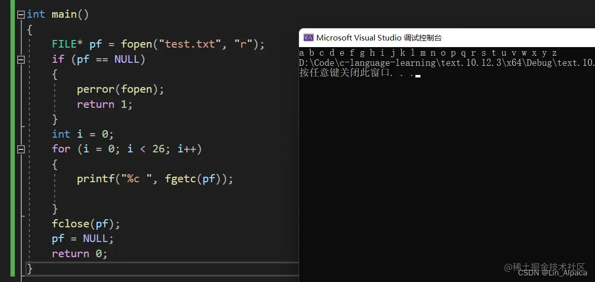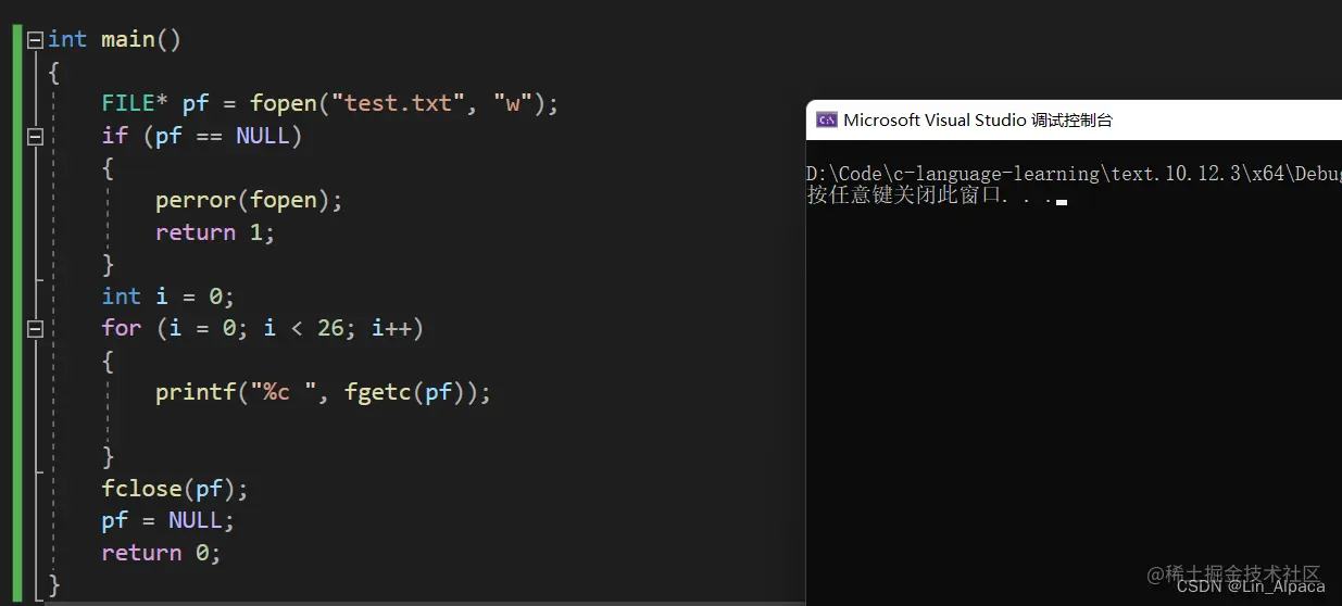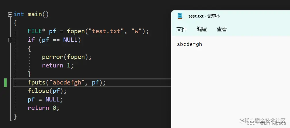 作用相当于动态内存中的 free ,只需传入前面打开文件时接收的指针用于关闭文件。与 free 相似关闭文件后前面 FILE* 类型的指针就变成了野指针,所以我们还需要讲该指针置空才能保证在往后的程序之中不会出现错误。