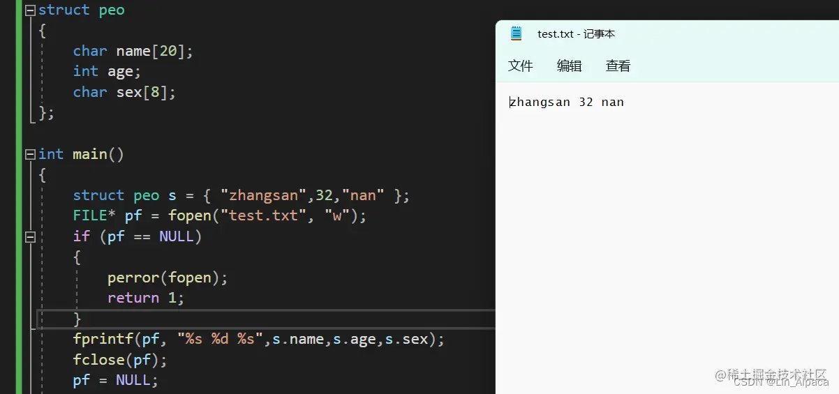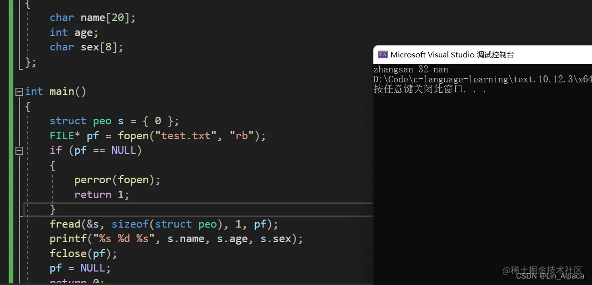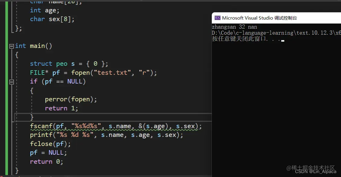 与 scanf 相似记得第一个参数是文件指针,其他用法与scanf相同。如此操作后我们便实现将文件中的数据输入到我们定义的一个结构体之中。