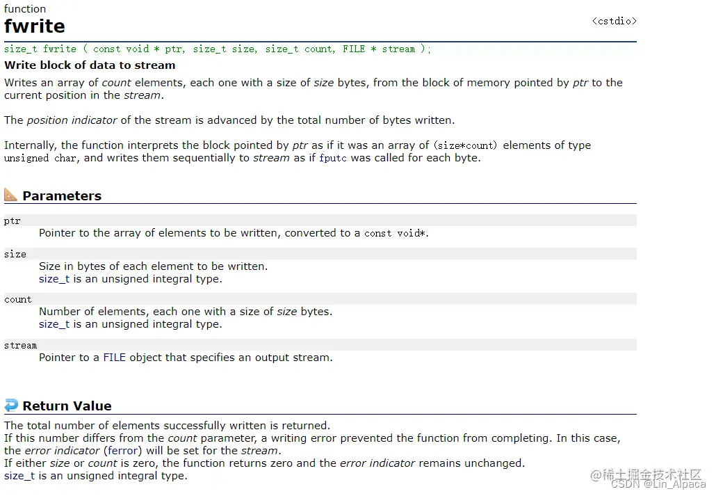 fwrite 可以将我们想要的内容用二进制的形式输出在文件之中。 ptr 为指向要输出值的指针, size 为输出值的大小单位为字节, count 为输出的数量。成功则返回成功写入的元素总数。