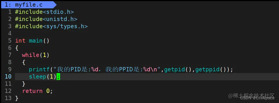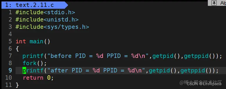 🥖同时我们还可以通过系统调用来获取进程的 PID 跟 PPID ,只需要将代码修改一下,包上头文件 <sys/types.h> ,之后使用 getpid () 就可以得到当前进程的 PID ,同理获取 PPID 则是getppid() 。