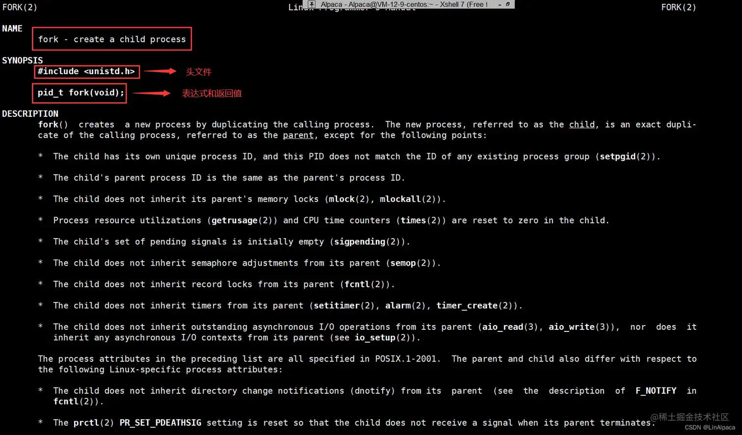 🥖先了解一下 fork 函数,根据文本 fork 函数会为我们创建一个子进程,之后返回一个 pid_t 类型的值,不需要传参数,子进程时其返回值是 0 ,返而返回给父进程子进程的 PID ,返回 -1 则代表创建失败。