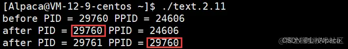 🥖像这样修改代码之后,可以观察到最后的打印出现两次,说明此时为两个进程,而 PID 与 PPID 恰好说明二者是父子进程的关系。