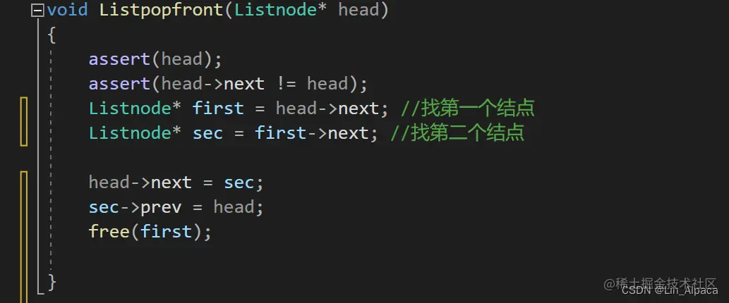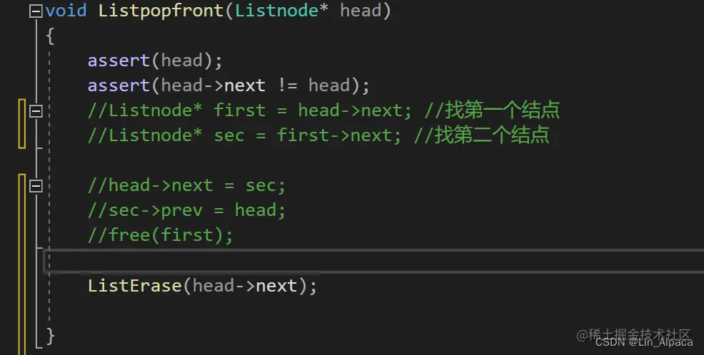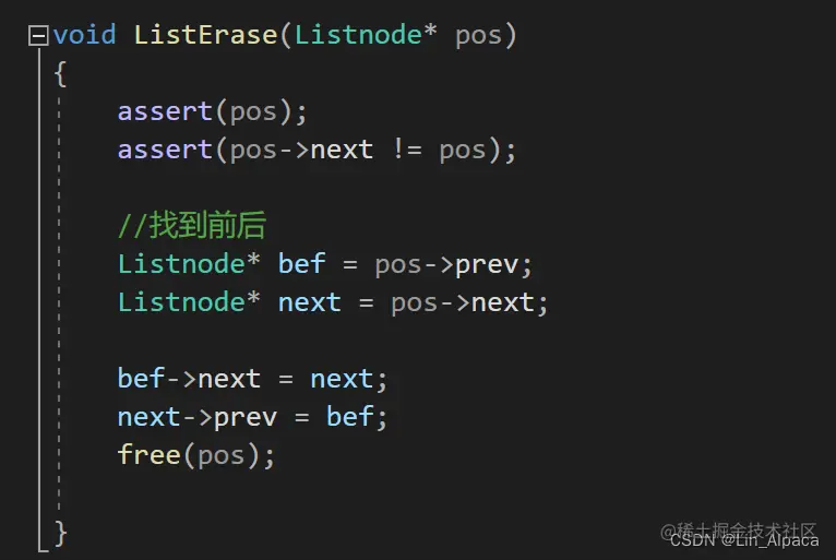 接收一个指针,判断一下删除两件套(传入指针是否为空及链表是否只有一个头结点),然后找到 pos 的前后结点将其链接起来后并将 pos 释放就完成目标。即便只有一个结点也能完成工作。