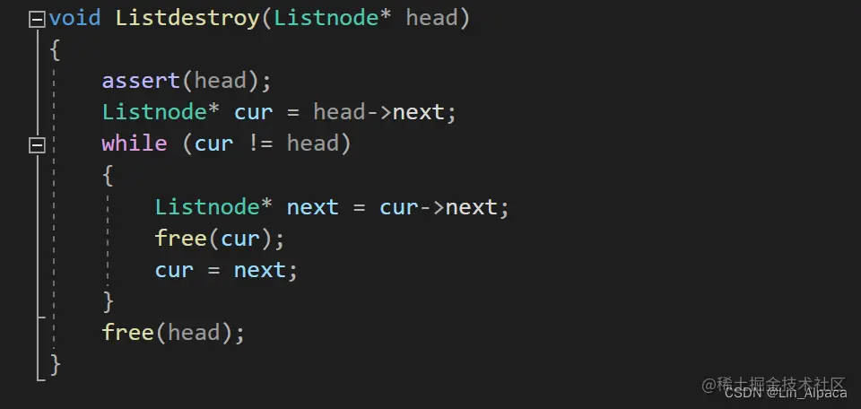 首先断言确保不是空指针,通过迭代一个一个释放链表的结点,最后别忘记头结点也要释放掉!!!