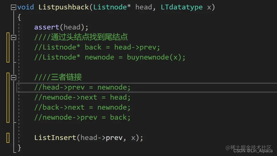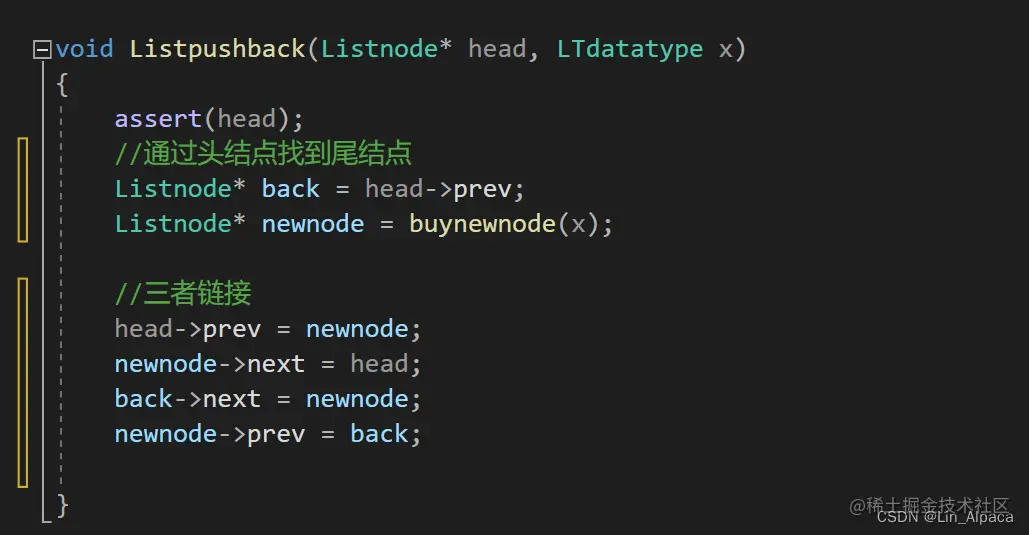 这边就可以直接感受到这个结构给我们带来的便利,我们只需对头结点进行断言之后通过头结点找到尾节点,并在二者之间插入新节点。值得注意的是,尾插是在尾结点跟头结点之间插入,而不是在尾结点前插入,要避免出现这样的误区。
