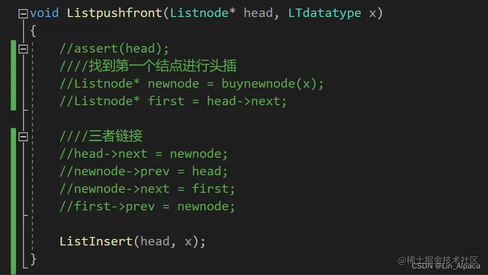 头插跟尾插的步骤相差不大,先断言传入的指针,之后需要找到第一个结点,在其于头结点之间插入新节点。