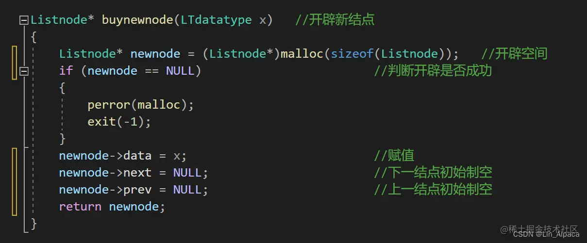 先使用malloc开辟结构体的空间,之后对开辟空间成功与否进行判断之后,对其赋值以及指向地址的初始化。 最后返回开辟的地址,完成一个结点的开辟。