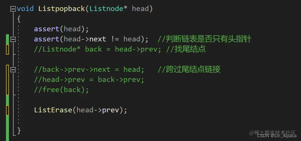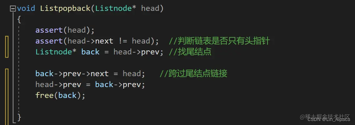 经过结构的升级,原本单链表原本不完善的结构已经完善,尾删一样变得非常简单通过头结点找到尾结点,再寻找到尾结点的上一个结点并将其于头结点链接起来就可以实现。