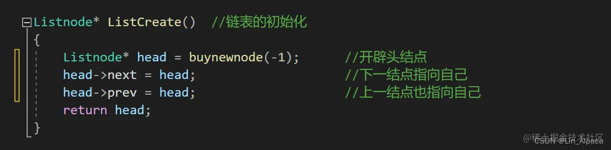 这是个带头的链表,所以在初始化的时候就要完成头结点的开辟,完成初步的循环。