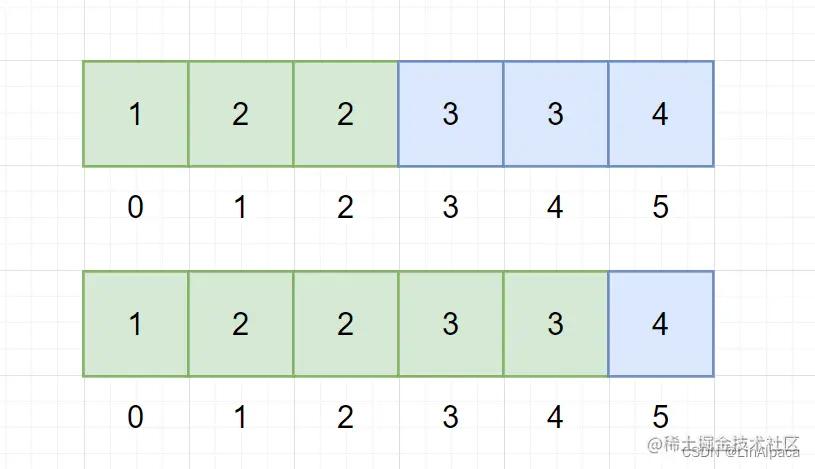 🥥而首尾两个点就能够用二分查找找到。分别是将数组由小于目标值和大于等于目标值、小于等于目标值和大于目标值两种分法进行划分,即进行两次二分查找,而这两次二分查找的两个分界点恰好就是一个区间的两个端点。