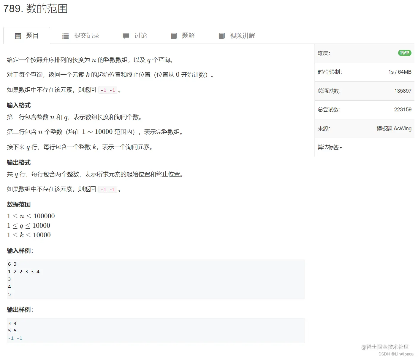 🥥即经过两次二分,分别查找左边界及右边界(若只有一个数则左右边界相等),查找一个边界后我们还可以进行一次特判,若当前端点并非我们要求的目标值,则说明这个数组之中并没有我们想要的值,因此便可以直接输出 -1 ,否则就再继续查找另一端点。