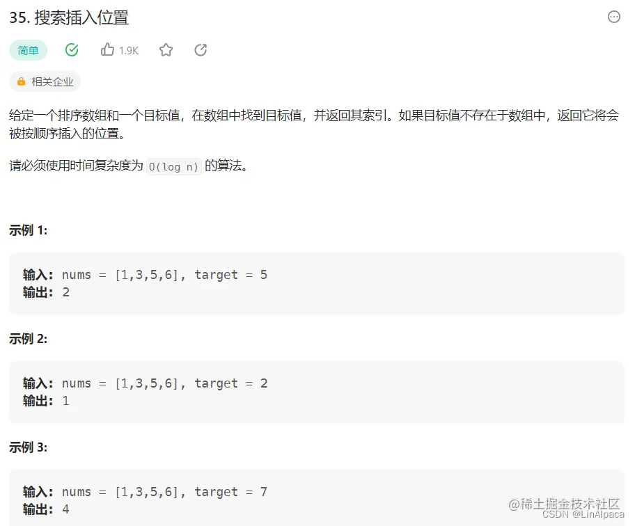 🥥这题难度相对简单,要我们在数组中找目标值,若找不到则返回目标值若插入到这个数组时的所在的下标。