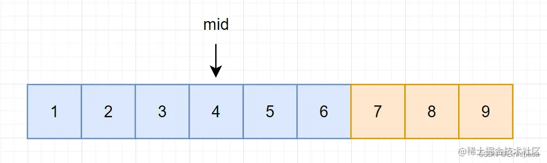 🥥假设当前我们有一个 1~9 的有序数组,现在我们要查找数组中的7。由此我们可以通过数字的大小将其分为小于 7 和 大于等于 7 的两个部分。
