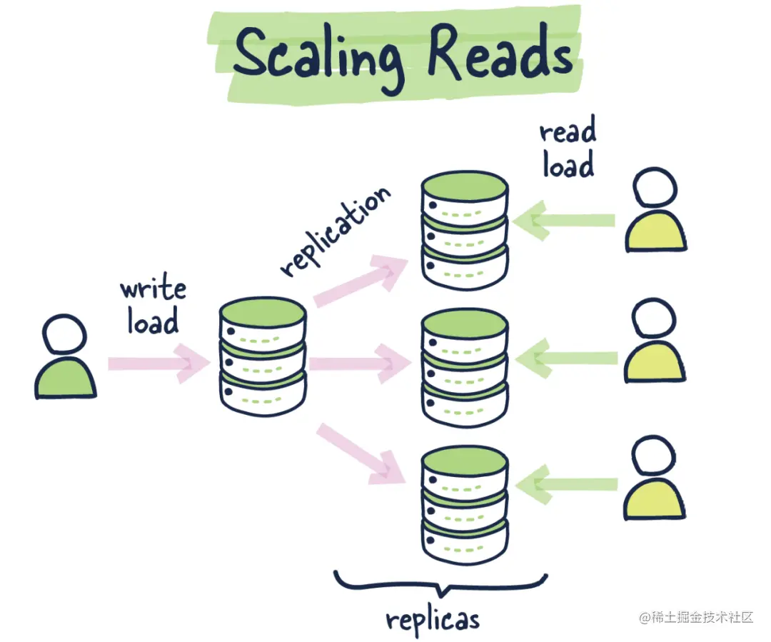 如果你对数据所做的大部分工作是读取,复制可以提高数据的可用性并加快读取数据的速度。这可以帮助你避免数据库分片的一些复杂性。可以通过制作更多数据库副本来提高读取性能。当然,假设你已经补充了缓存。这可以通过负载均衡或根据他们在世界上的位置路由查询来完成。