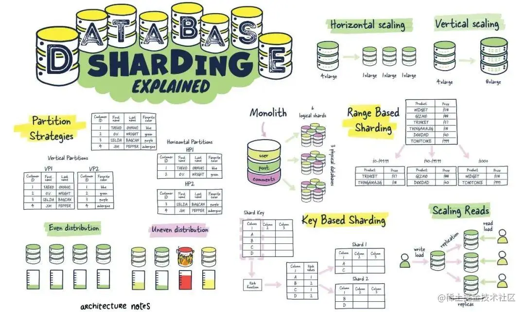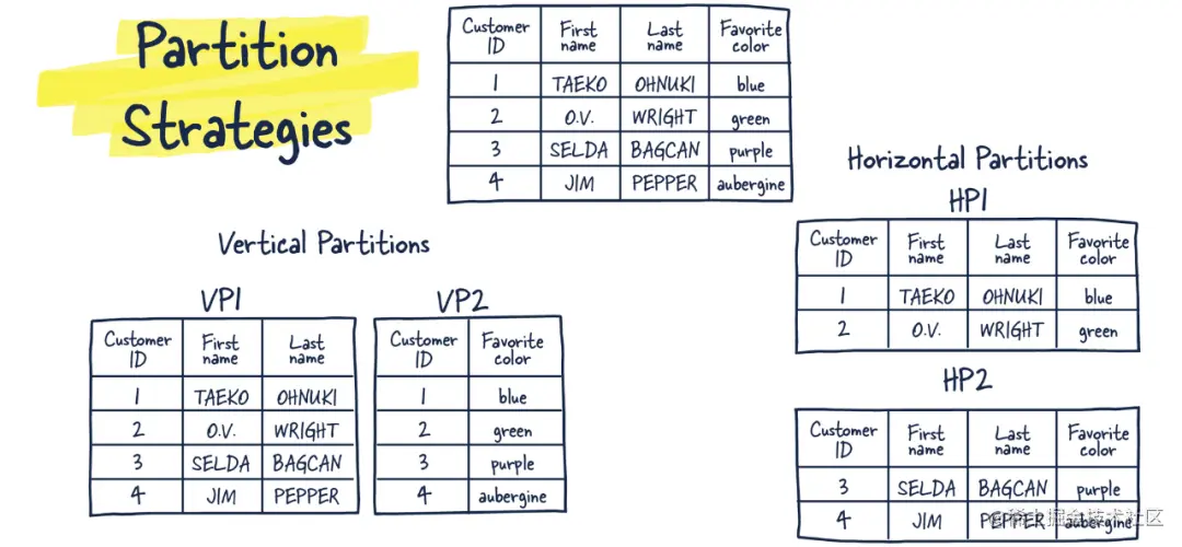 你也可以通过几种方式对数据进行分区并将特定表移动到它们自己的数据库中,这与你在微服务架构中看到的非常相似,程序的特定部分有其自身数据库服务器。程序知道每个数据库该在哪里寻找。或者,你可以跨多个数据库节点存储同一个表的行,这带来了分片键等想法;稍后会详细介绍。