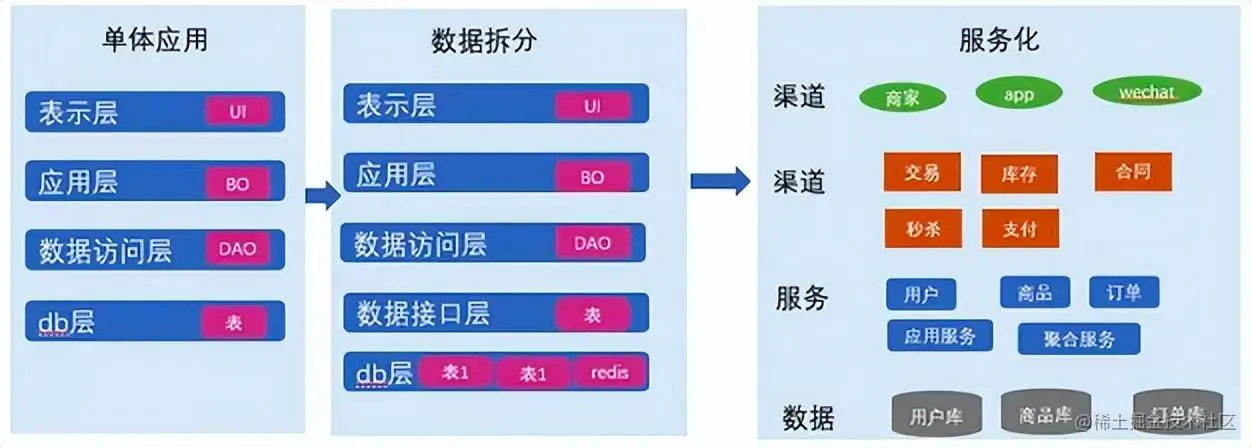 架构演进路程:单体应用->分布式应用服务化-> 微服务。