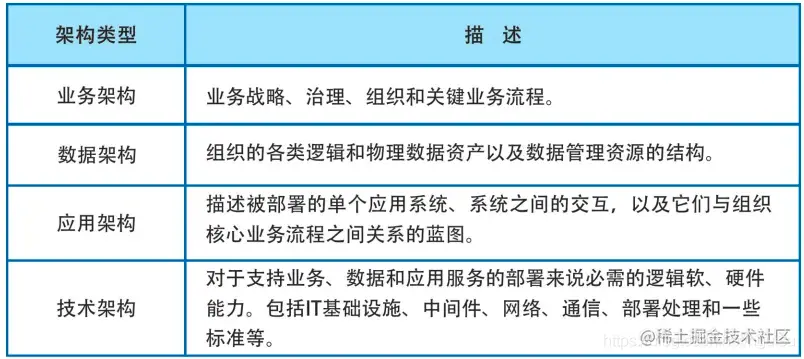 由于不同架构方法论,定义的架构分类也不同,RUP4+1 架构方法主要是以架构生命周期为视角进行描述,而 TOGAF9 按架构涉及内容维度来描述。因此我结合两者细分为业务架构、应用架构、数据架构、技术架构, 代码架构, 部署架构。