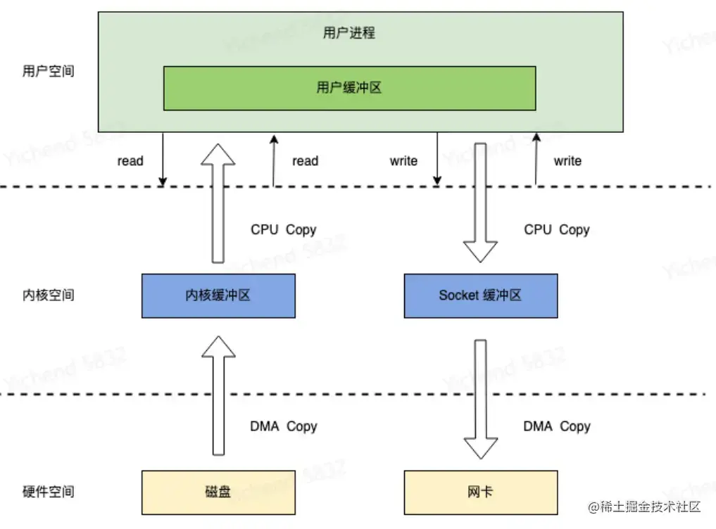 - 内核进程会从 内核缓冲区 中查看以前是否命中过对应的内容,若有,则直接通过 CPU 将数据拷贝到用户缓冲区,给用户进程使用;若没命中,内核进程会通过 DMA(直接存储访问)发起文件读取请求,DMA 会将磁盘中的相关文件拷贝到内核缓冲区,当内核缓冲区有数据,则会 向 CPU 发送指令,CPU 就会 将数据从内核缓冲区拷贝到用户缓冲区。