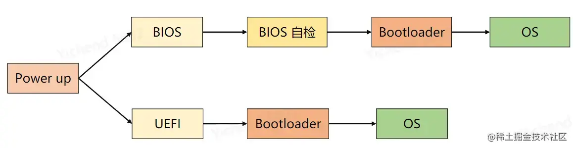 UEFI 像是新一代的 BIOS,要比 BIOS 的功能更强大,启动速度更快,解决优化了 BIOS 自检流程,同时 BIOS 启动会配合 MBR 分区,无法引导启动超过 2.2T 的磁盘,而 UEFI 一般会配合 GPT 分区,支持引导超过 2.2T 的磁盘。UEFI启动流程跳转
