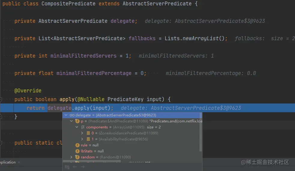 delegateprimary首选的Predicate断言器。注意:它可能是一个,也可能是多个断言器组成的一个chainfallbacks回退。当然primary没有达到过滤的要求的时候,会时候fallabck里的进行过滤minimalFilteredServers默认值是1minimalFilteredPercentage上面是按照个数,这是按照百分比控制阈值,默认值是0 接下来一直调用到过滤器的循环过滤逻辑- 以上两个参数代表阈值:表示经过过滤后,我最少希望有1台服务器