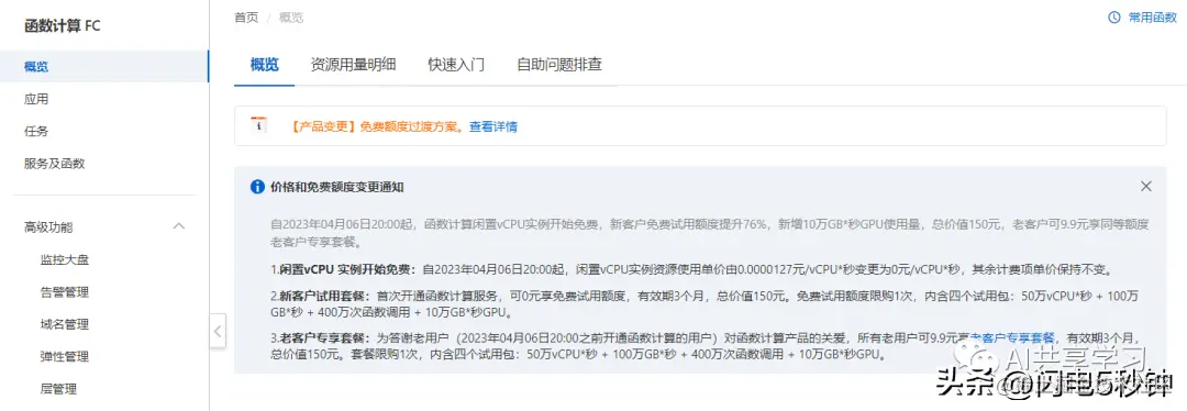 大家可能担心函数FC的成本问题,这里假如个人用的话可以忽略不计,阿里云的函数FC按量计算,个人的使用量基本可以忽略;