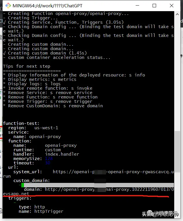到这里你的OpenAI,代理服务已经部署成功了,上边的domain是社区提供的免费地址,有可能过期就不能访问了,所以建议配置自己的域名。